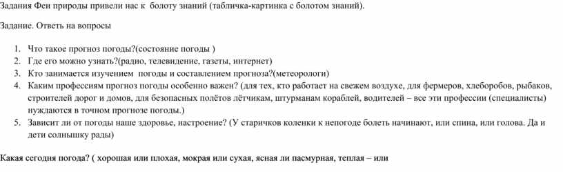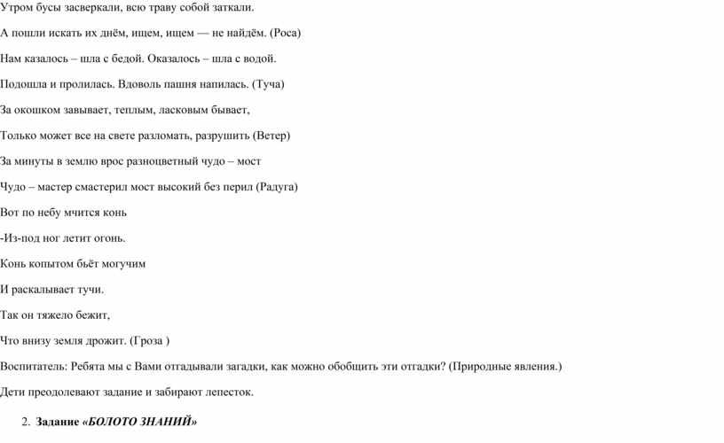 Пушистая вата плывёт куда-то. Чем вата ниже, тем дождик ближе (Облако) Утром бусы засверкали, всю траву собой заткали. А пошли искать их днём, ищем, ищем — не найдём. (Роса) Нам казалось – шла с бедой. Оказалось – шла с водой. Подошла и пролилась. Вдоволь пашня напилась. (Туча) За окошком завывает, теплым, ласковым бывает, Только может все на свете разломать, разрушить (Ветер) За минуты в землю врос разноцветный чудо – мост Чудо – мастер смастерил мост высокий без перил (Радуга) Вот по небу мчится конь -Из-под ног летит огонь. Конь копытом бьёт могучим И раскалывает тучи. Так он тяжело бежит, Что внизу земля дрожит. (Гроза ) Воспитатель: Ребята мы с Вами отгадывали загадки, как можно обобщить эти отгадки? (Природные явления.) Дети преодолевают задание и забирают лепесток. 2. Задание «БОЛОТО ЗНАНИЙ» Задания Феи природы привели нас к болоту знаний (табличка-картинка с болотом знаний). Задание. Ответь на вопросы