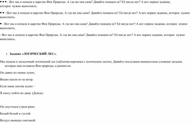 1. Задание «ЛОГИЧЕСКИЙ ЛЕС». Мы попали в загадочный логический лес (табличка-картинка с логическим лесом). Давайте послушаем внимательно сложные загадки, которые нам оставила Фея природы, и решим их. Он давно по окнам лупит, Видно капли из-за штор. Если мама зонтик купит – Я смогу пойти во двор. (Дождь)