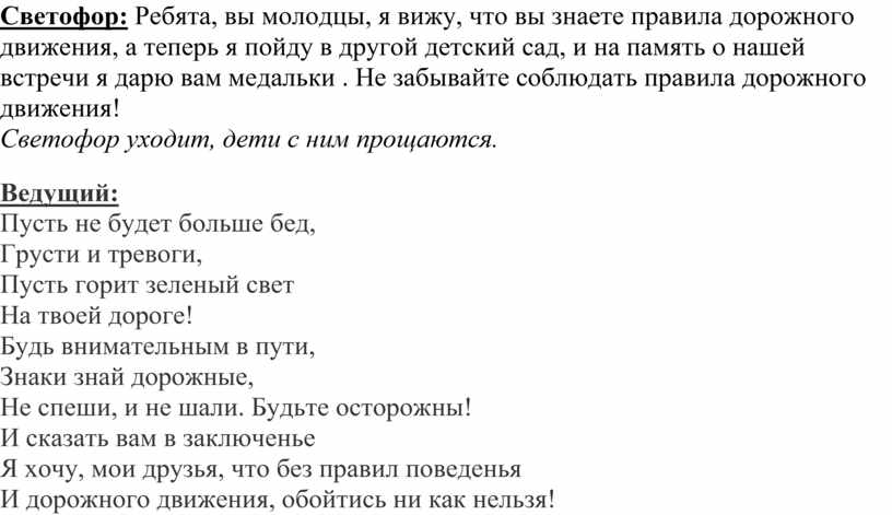 Светофор: Ребята, вы молодцы, я вижу, что вы знаете правила дорожного движения, а теперь я пойду в другой детский сад, и на память о нашей встречи я дарю вам медальки . Не забывайте соблюдать правила дорожного движения!