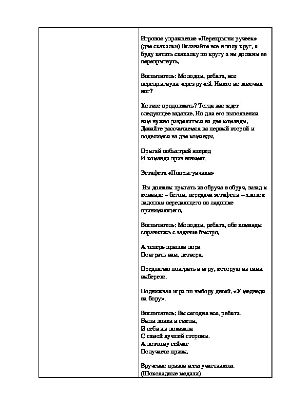 Материалы и оборудование:2 скакалки, 6 обручей, 2 флажка, 2 стойки, веревка (бечевка), 6 кеглей, 4 мягких мяча.