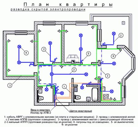 Важно! Для упрощения прокладки проводки к розеткам провода можно уложить под пол. Провода для верхнего освещения прокладываются внутри плит перекрытия. Эти два способа хорошо применять, если не хочется штробить стены. На схеме такая проводка отмечается пунктиром.
