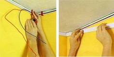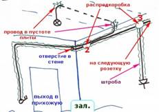 Что касается потолка, то тут есть несколько вариантов решения вопроса с размещением и закреплением проводки. Первый – если потолок будет навесной или натяжной, то вся проводка просто закрепляется к перекрытию. Второй – делается неглубокаяштроба для проводки. Третий – проводка прячется в перекрытии потолка. Первые два варианта предельно просты в исполнении. А вот для третьего придется сделать некоторые пояснения. В панельных домах используются перекрытия с внутренними пустотами, достаточно сделать два отверстия и протянуть внутри перекрытия провода.