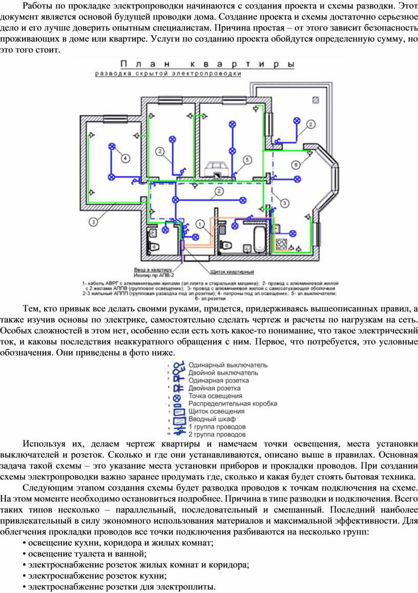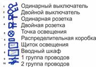 Тем, кто привык все делать своими руками, придется, придерживаясь вышеописанных правил, а также изучив основы по электрике, самостоятельно сделать чертеж и расчеты по нагрузкам на сеть. Особых сложностей в этом нет, особенно если есть хоть какое-то понимание, что такое электрический ток, и каковы последствия неаккуратного обращения с ним. Первое, что потребуется, это условные обозначения. Они приведены в фото ниже.
