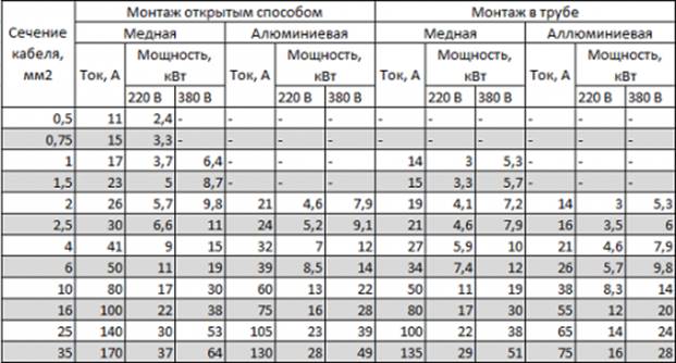 На практике сила тока в сети для современных квартир редко когда превышает 25 А. Исходя из этого, и подбираются все материалы. В первую очередь это касается сечения электропроводки. Чтобы облегчить выбор, в приведенной ниже таблице указаны основные параметры провода и кабеля: