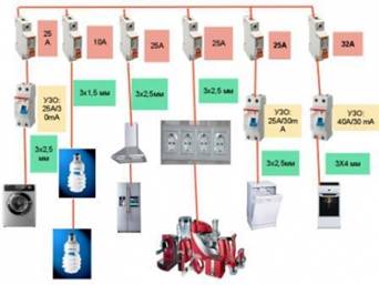 Чтобы узнать точную длину провода, придется немного побегать с рулеткой по дому, а к полученному результату добавить еще 3 – 4 метра запаса. Все провода подключаются к щитку освещения, который устанавливается при входе. В щиток монтируются автоматы защиты. Обычно это УЗО на 16 А и 20 А. Первые используются для освещения и выключателей, вторые для розеток. Для электроплиты устанавливается отдельный УЗО на 32 А, но если мощность плиты превышает 7 кВт, тогда ставят УЗО на 63 А.