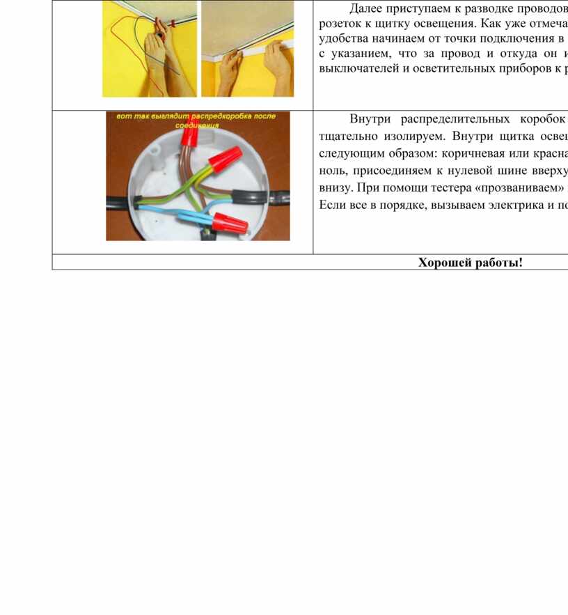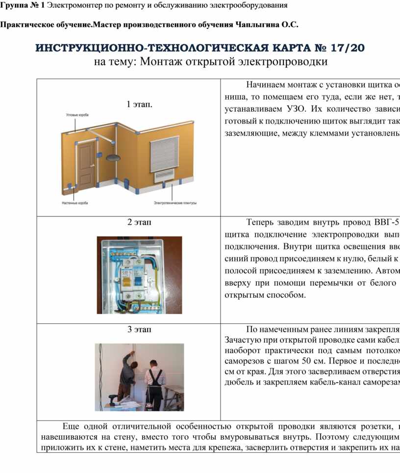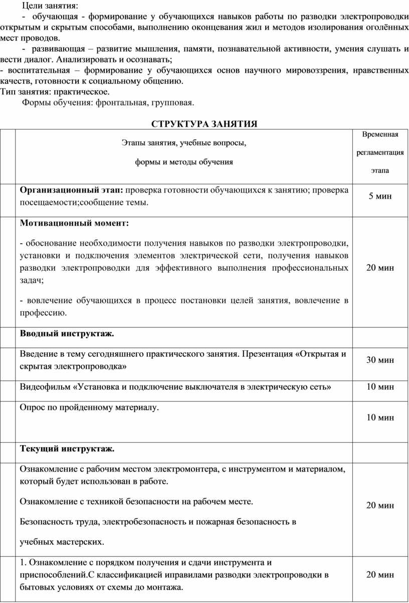 Мотивационный момент: - обоснование необходимости получения навыков по разводки электропроводки, установки и подключения элементов электрической сети, получения навыков разводки электропроводки для эффективного выполнения профессиональных задач; - вовлечение обучающихся в процесс постановки целей занятия, вовлечение в профессию. |