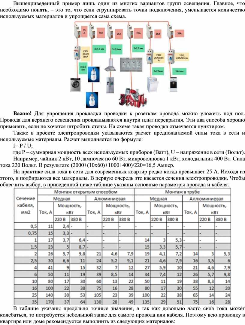 Также в проекте электропроводки указываются расчет предполагаемой силы тока в сети и используемые материалы. Расчет выполняется по формуле: