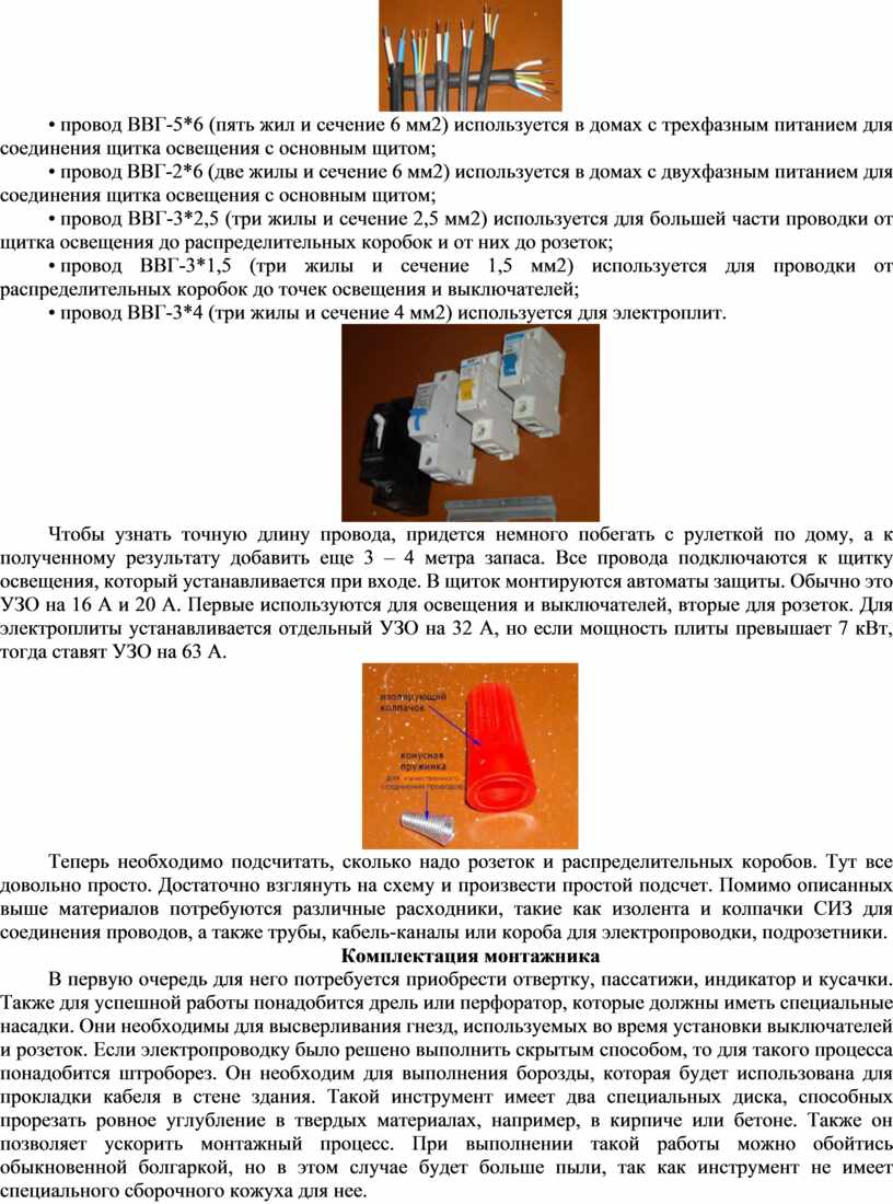 • провод ВВГ-3*2,5 (три жилы и сечение 2,5 мм2) используется для большей части проводки от щитка освещения до распределительных коробок и от них до розеток;