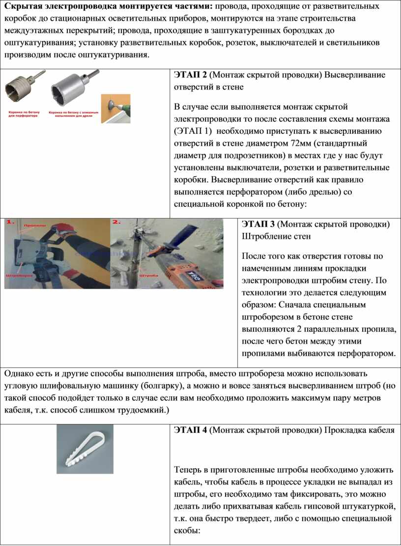 Монтаж скрытой электропроводки — это более трудоемкий процесс, при котором электрическая проводка прячется под обшивку стен, либо укладывается в штробы: Первый шаг. Второй шаг. Третий шаг. |
