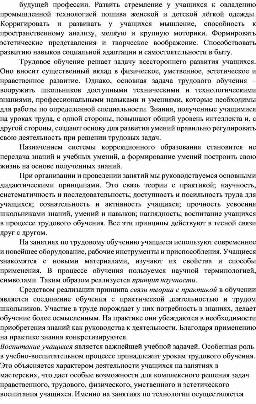 Воспитание учащихся является важнейшей учебной задачей. Особенная роль в учебно-воспитательном процессе принадлежит урокам трудового обучения. Это объясняется характером деятельности учащихся на занятиях в мастерских, что дает особые возможности для комплексного решения задач нравственного, трудового, физического, умственного и эстетического воспитания учащихся. Именно на занятиях по технологии осуществляется психологическая и практическая подготовка к труду. При правильной организации занятий у учащихся крепнет чувство коллективизма. На уроках мы прививаем общие правила культуры труда (уход за рабочей одеждой, содержание в порядке рабочего места, работа исправным инструментом).