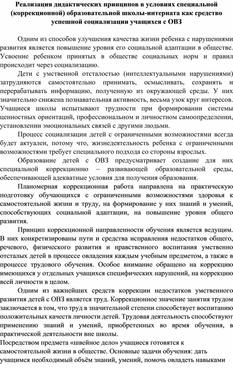 Реализация дидактических принципов в условиях специальной (коррекционной) образовательной школы-интерната как средство успешной социализации учащихся с ОВЗ