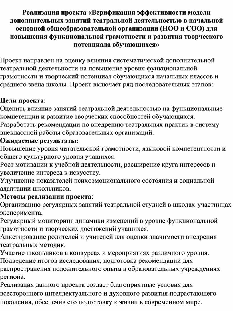 Реализация проекта «Верификация эффективности модели дополнительных занятий театральной деятельностью в начальной основной общеобразовательной организации (НОО и СОО) для повышения функциональной грамотности и развития творческого потенциала обучающихся»