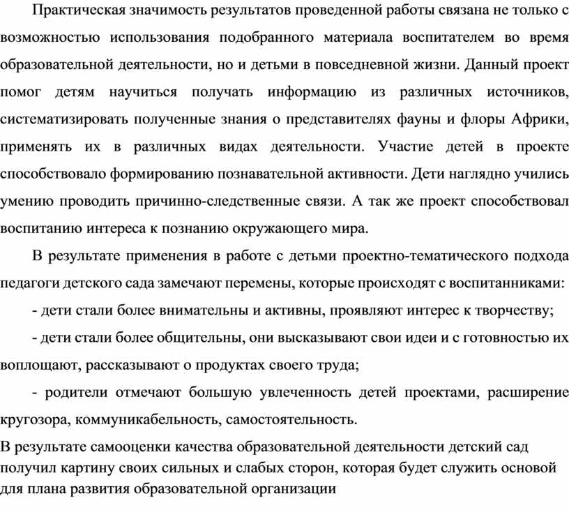 Каждый день работы воспитателя напоминает викторину, где дети задают вопросы, которые могут поставить в тупик любого взрослого. Можно просто отвечать на такие вопросы, но гораздо полезнее помочь детям найти ответы на них самостоятельно, таким образом предоставив возможность раскрыть свой творческий потенциал. Мастерство воспитателя на этом этапе заключается в умении мотивировать и заинтересовывать каждого ребенка. Во время детского совета Максим С. спросил: «Что длиннее, змея или хобот слона?». Дети стали рассуждать, строить предположения и задавать вопросы, которые воспитатель записывал. Чтобы ответить на все вопросы детей, педагог предложил им собрать материалы и изучить тему: «Животные Африки». Работа велась в течение двух недель и интерес не иссякал. Каждый день дети задавали новые вопросы, делились новыми знаниями, приносили из дома иллюстрации, книги, поделки. Были изучены не только животные, проживающие на территории Африки, но и птицы, насекомые, создан макет саванны, организованы выставки детских поделок и рисунков. Дети получили знания о культуре и традициях африканского народа. Практическая значимость результатов проведенной работы связана не только с возможностью использования подобранного материала воспитателем во время образовательной деятельности, но и детьми в повседневной жизни. Данный проект помог детям научиться получать информацию из различных источников, систематизировать полученные знания о представителях фауны и флоры Африки, применять их в различных видах деятельности. Участие детей в проекте способствовало формированию познавательной активности. Дети наглядно учились умению проводить причинно-следственные связи. А так же проект способствовал воспитанию интереса к познанию окружающего мира.