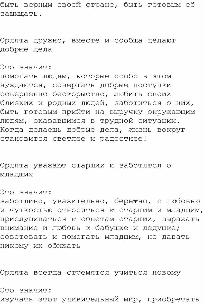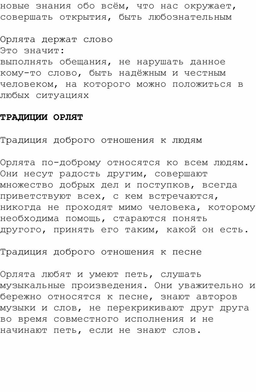 Орлята по-доброму относятся ко всем людям. Они несут радость другим, совершают множество добрых дел и поступков, всегда приветствуют всех, с кем встречаются, никогда не проходят мимо человека, которому необходима помощь, стараются понять другого, принять его таким, какой он есть.