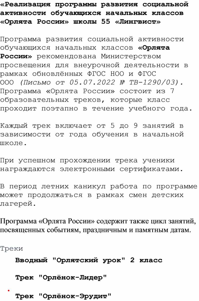 «Реализация программы развития социальной активности обучающихся начальных классов «Орлята России» школы 55 «Лингвист»