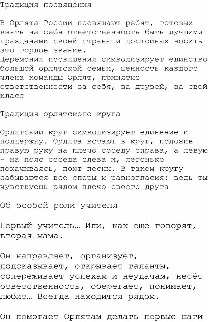 Орлятский круг символизирует единение и поддержку. Орлята встают в круг, положив правую руку на плечо соседу справа, а левую – на пояс соседа слева и, легонько покачиваясь, поют песни. В таком кругу забываются все споры и разногласия: ведь ты чувствуешь рядом плечо своего друга