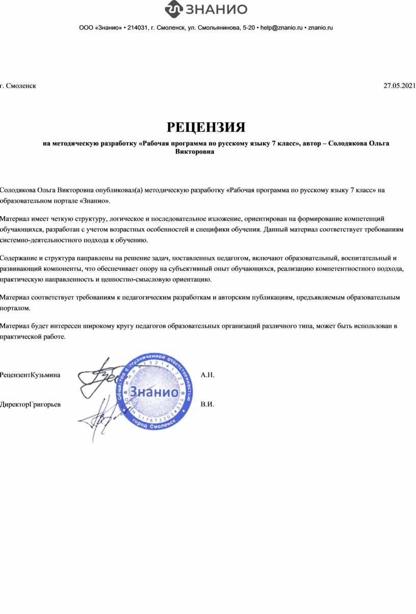 Солодякова Ольга Викторовна опубликовал(а) методическую разработку «Рабочая программа по русскому языку 7 класс» на образовательном портале «Знанио».