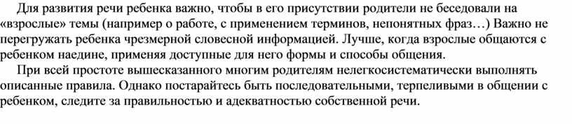 Для развития речи ребенка важно, чтобы в его присутствии родители не беседовали на «взрослые» темы (например о работе, с применением терминов, непонятных фраз…) Важно не перегружать ребенка чрезмерной словесной информацией. Лучше, когда взрослые общаются с ребенком наедине, применяя доступные для него формы и способы общения.