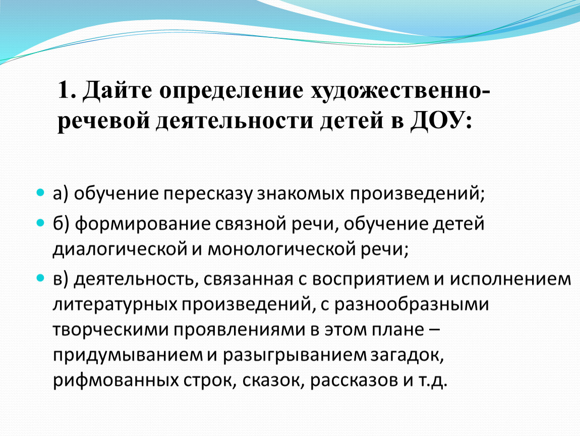 1. Дайте определение художественно-речевой деятельности детей в ДОУ: