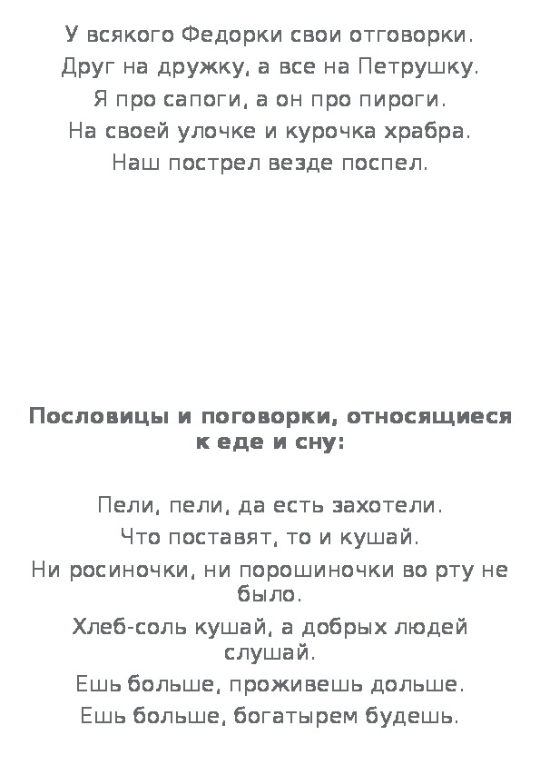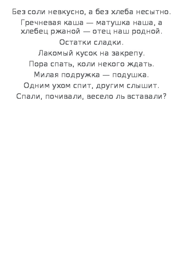 Ешь больше, богатырем будешь.Без соли невкусно, а без хлеба несытно.