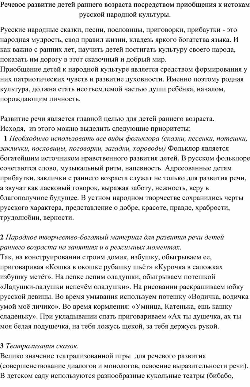 Речевое развитие детей раннего возраста посредством приобщения к истокам русской народной культуры.