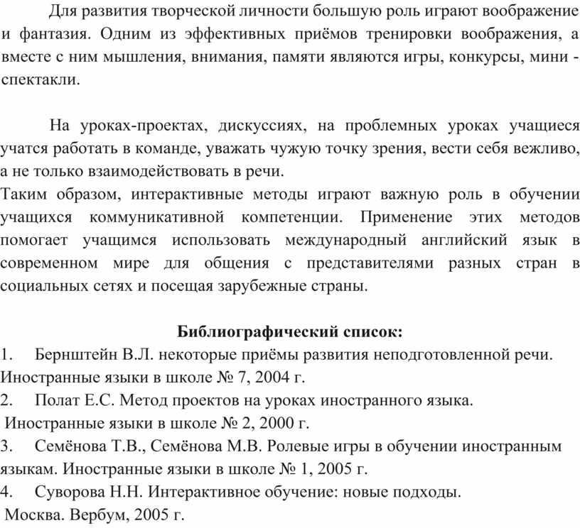 Таким образом, интерактивные методы играют важную роль в обучении учащихся коммуникативной компетенции. Применение этих методов помогает учащимся использовать международный английский язык в современном мире для общения с представителями разных стран в социальных сетях и посещая зарубежные страны.