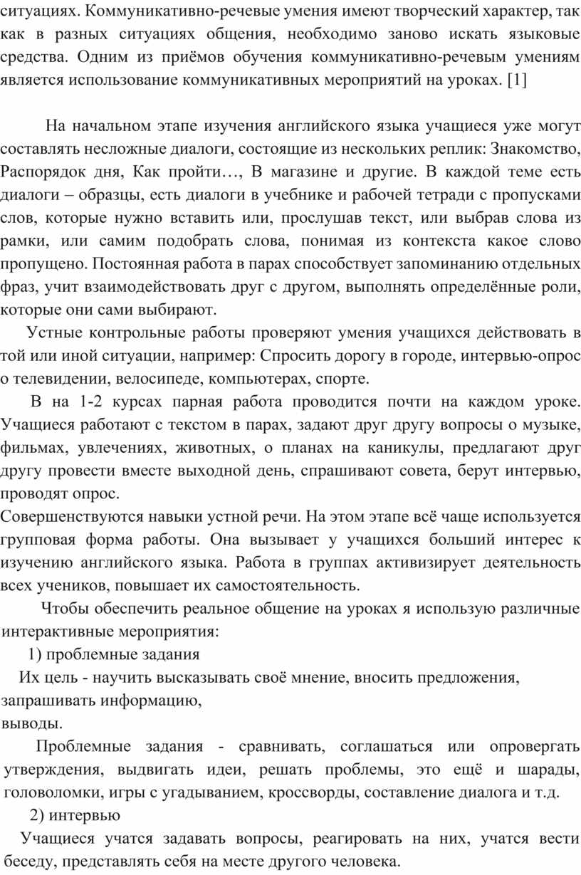 Интерактивный подход помогает учителю развивать у учащихся умение непринуждённого общения на иностранном языке в реальных жизненных ситуациях. Коммуникативно-речевые умения имеют творческий характер, так как в разных ситуациях общения, необходимо заново искать языковые средства. Одним из приёмов обучения коммуникативно-речевым умениям является использование коммуникативных мероприятий на уроках. [1]
