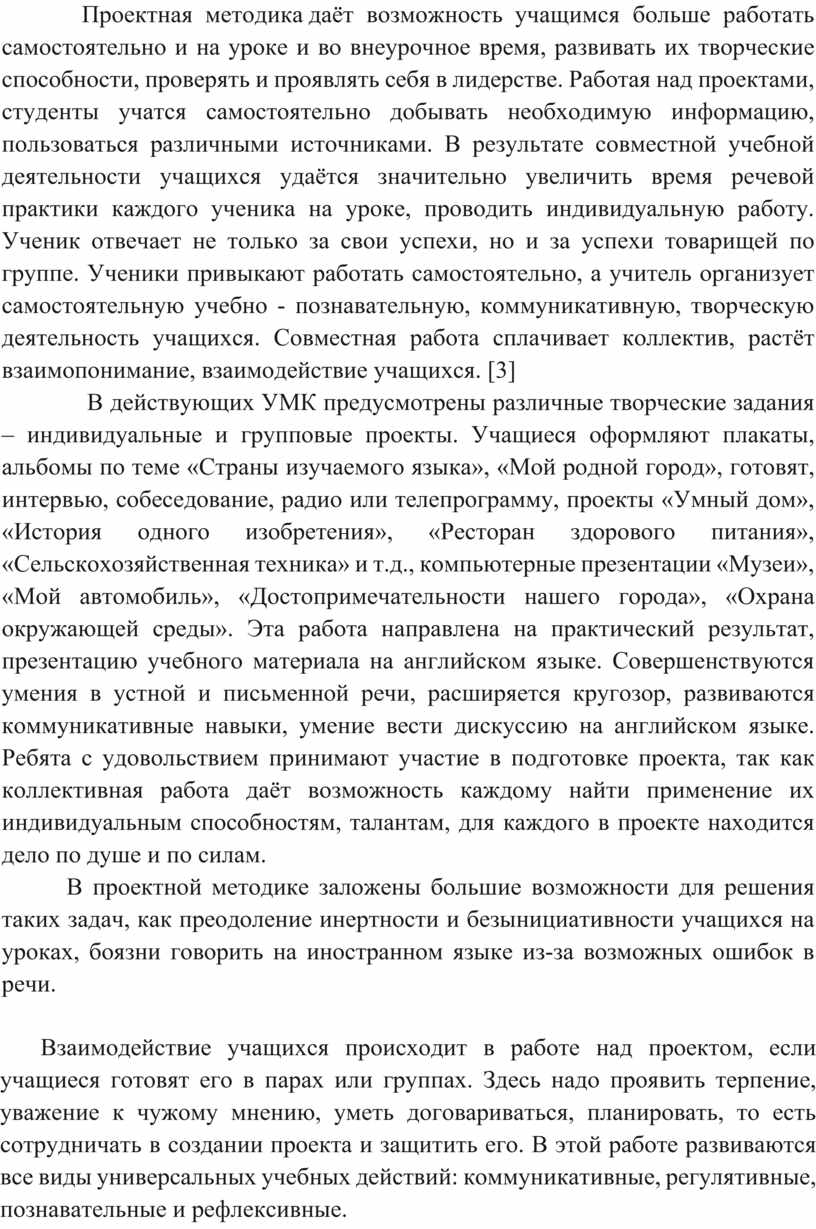 Проектная методика даёт возможность учащимся больше работать самостоятельно и на уроке и во внеурочное время, развивать их творческие способности, проверять и проявлять себя в лидерстве. Работая над проектами, студенты учатся самостоятельно добывать необходимую информацию, пользоваться различными источниками. В результате совместной учебной деятельности учащихся удаётся значительно увеличить время речевой практики каждого ученика на уроке, проводить индивидуальную работу. Ученик отвечает не только за свои успехи, но и за успехи товарищей по группе. Ученики привыкают работать самостоятельно, а учитель организует самостоятельную учебно - познавательную, коммуникативную, творческую деятельность учащихся. Совместная работа сплачивает коллектив, растёт взаимопонимание, взаимодействие учащихся. [3]