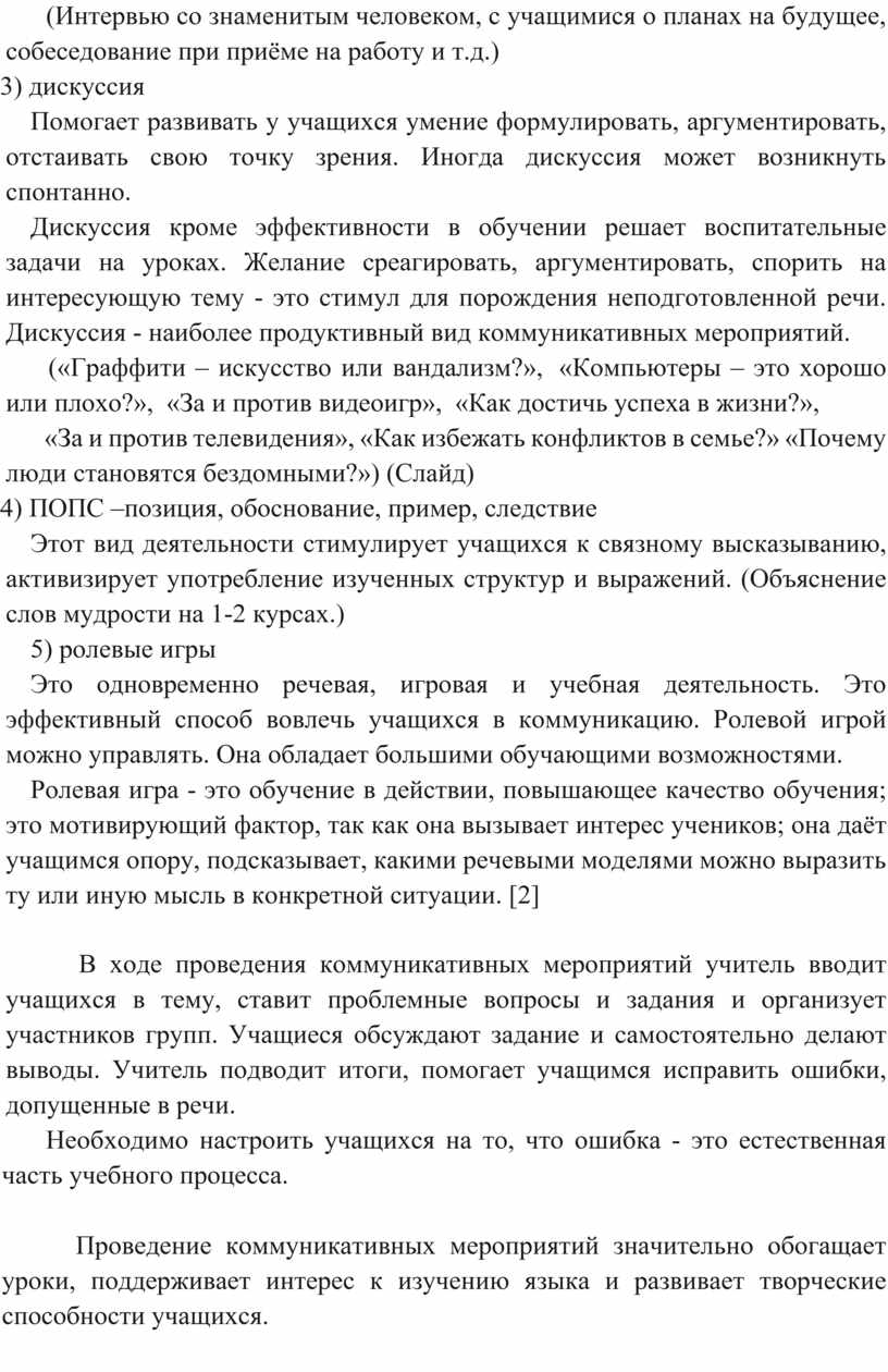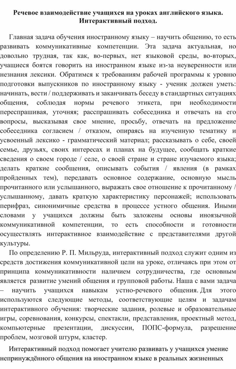 По определению Р. П. Мильруда, интерактивный подход служит одним из средств достижения коммуникативной цели на уроке, отличаясь при этом от принципа коммуникативности наличием сотрудничества, где основным является развитие умений общения и групповой работы. Наша с вами задача – научить учащихся навыкам устно-речевого общения. Для этого используются следующие методы, соответствующие целям и задачам интерактивного обучения: творческие задания, ролевые и образовательные игры, соревнования, конкурсы, спектакли, представления, проектный метод, компьютерные презентации, дискуссии, ПОПС-формула, разрешение проблем, мозговой штурм, кластер.