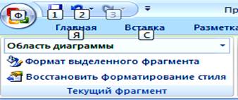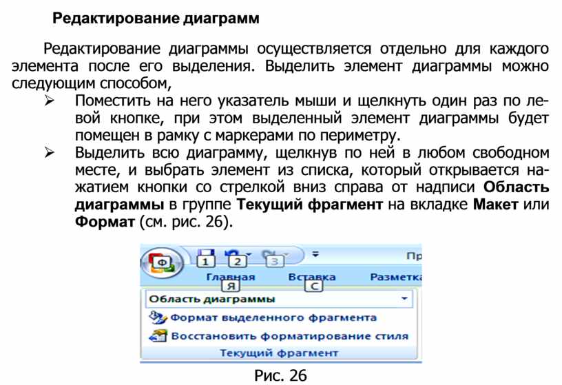 Ø Выделить всю диаграмму, щелкнув по ней в любом свободном месте, и выбрать элемент из списка, который открывается на- жатием кнопки со стрелкой вниз справа от надписи Область диаграммы в группе Текущий фрагмент на вкладке Макет или Формат (см. рис. 26).