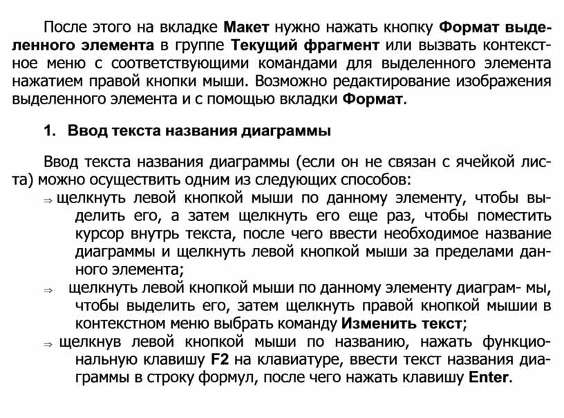 Þ щелкнув левой кнопкой мыши по названию, нажать функцио- нальную клавишу F2 на клавиатуре, ввести текст названия диа- граммы в строку формул, после чего нажать клавишу Enter.