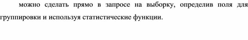Более простым способом обработки результирующих данных запроса является группировка и вычисление различных итоговых значений. Это можно сделать прямо в запросе на выборку, определив поля для группировки и используя статистические функции.