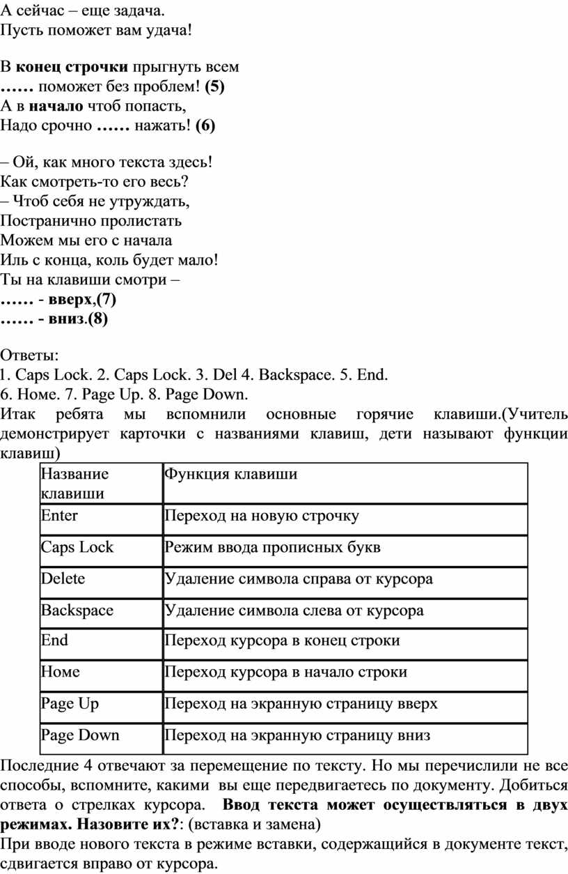 Последние 4 отвечают за перемещение по тексту. Но мы перечислили не все способы, вспомните, какими вы еще передвигаетесь по документу. Добиться ответа о стрелках курсора. Ввод текста может осуществляться в двух режимах. Назовите их?: (вставка и замена)