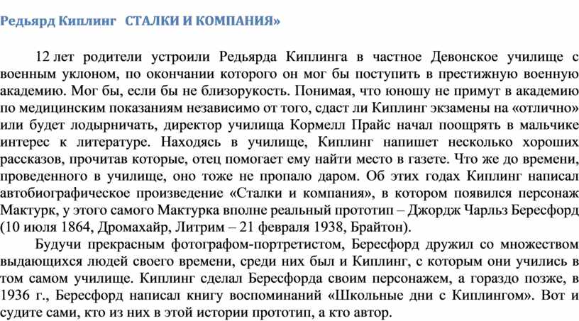 12 лет родители устроили Редьярда Киплинга в частное Девонское училище с военным уклоном, по окончании которого он мог бы поступить в престижную военную академию. Мог бы, если бы не близорукость. Понимая, что юношу не примут в академию по медицинским показаниям независимо от того, сдаст ли Киплинг экзамены на «отлично» или будет лодырничать, директор училища Кормелл Прайс начал поощрять в мальчике интерес к литературе. Находясь в училище, Киплинг напишет несколько хороших рассказов, прочитав которые, отец помогает ему найти место в газете. Что же до времени, проведенного в училище, оно тоже не пропало даром. Об этих годах Киплинг написал автобиографическое произведение «Сталки и компания», в котором появился персонаж Мактурк, у этого самого Мактурка вполне реальный прототип – Джордж Чарльз Бересфорд (10 июля 1864, Дромахайр, Литрим – 21 февраля 1938, Брайтон).