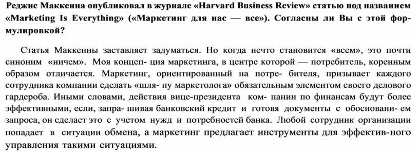Реджис Маккенна опубликовал в журнале «Harvard Business Review» статью под названием «Marketing Is Everything» («Маркетинг для нас — все»). Согласны ли Вы с этой фор мулировкой?