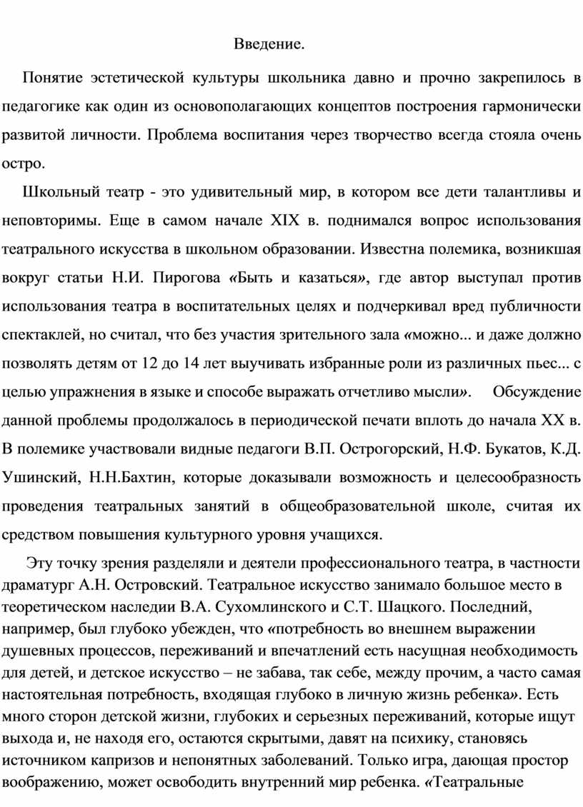 Школьный театр - это удивительный мир, в котором все дети талантливы и неповторимы. Еще в самом начале ХIХ в. поднимался вопрос использования театрального искусства в школьном образовании. Известна полемика, возникшая вокруг статьи Н.И. Пирогова «Быть и казаться», где автор выступал против использования театра в воспитательных целях и подчеркивал вред публичности спектаклей, но считал, что без участия зрительного зала «можно... и даже должно позволять детям от 12 до 14 лет выучивать избранные роли из различных пьес... с целью упражнения в языке и способе выражать отчетливо мысли». Обсуждение данной проблемы продолжалось в периодической печати вплоть до начала ХХ в. В полемике участвовали видные педагоги В.П. Острогорский, Н.Ф. Букатов, К.Д. Ушинский, Н.Н.Бахтин, которые доказывали возможность и целесообразность проведения театральных занятий в общеобразовательной школе, считая их средством повышения культурного уровня учащихся.