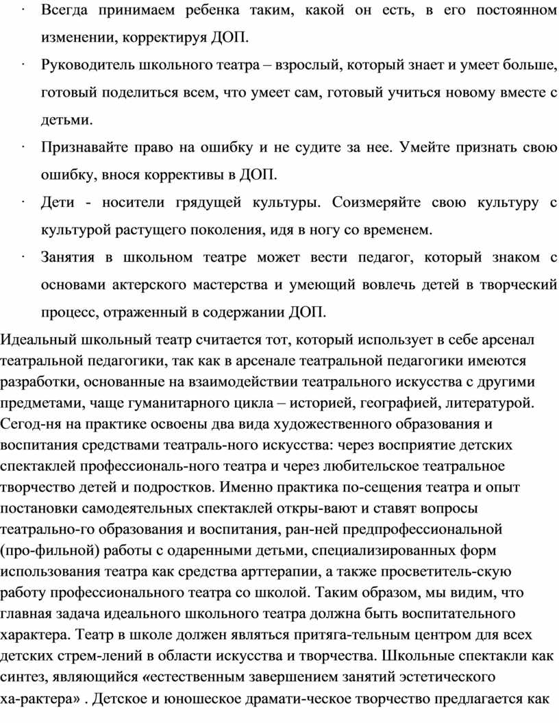 · Занятия в школьном театре может вести педагог, который знаком с основами актерского мастерства и умеющий вовлечь детей в творческий процесс, отраженный в содержании ДОП.