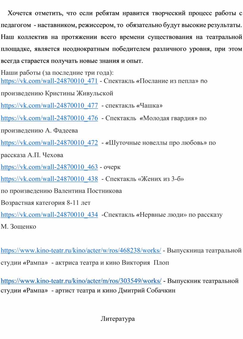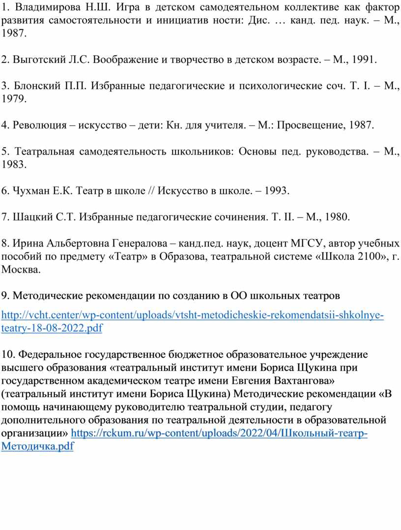 10. Федеральное государственное бюджетное образовательное учреждение высшего образования «театральный институт имени Бориса Щукина при государственном академическом театре имени Евгения Вахтангова» (театральный институт имени Бориса Щукина) Методические рекомендации «В помощь начинающему руководителю театральной студии, педагогу дополнительного образования по театральной деятельности в образовательной организации» https://rckum.ru/wp-content/uploads/2022/04/Школьный-театр-Методичка.pdf
