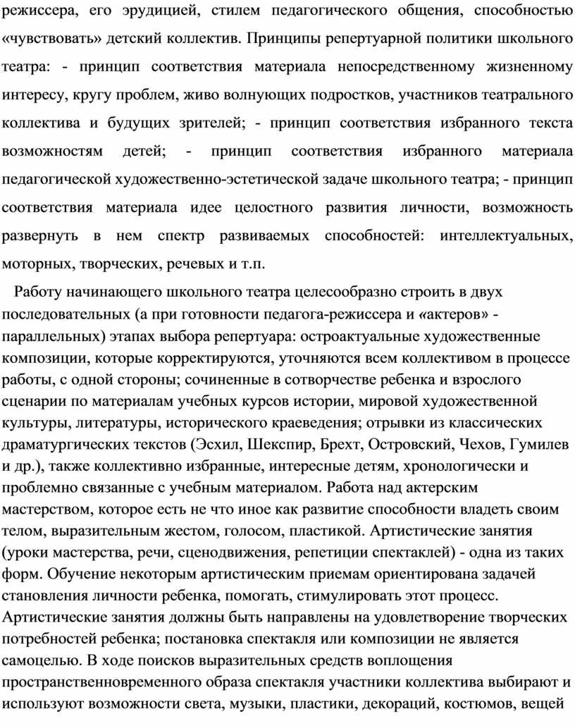 Работу начинающего школьного театра целесообразно строить в двух последовательных (а при готовности педагога-режиссера и «актеров» - параллельных) этапах выбора репертуара: остроактуальные художественные композиции, которые корректируются, уточняются всем коллективом в процессе работы, с одной стороны; сочиненные в сотворчестве ребенка и взрослого сценарии по материалам учебных курсов истории, мировой художественной культуры, литературы, исторического краеведения; отрывки из классических драматургических текстов (Эсхил, Шекспир, Брехт, Островский, Чехов, Гумилев и др.), также коллективно избранные, интересные детям, хронологически и проблемно связанные с учебным материалом. Работа над актерским мастерством, которое есть не что иное как развитие способности владеть своим телом, выразительным жестом, голосом, пластикой. Артистические занятия (уроки мастерства, речи, сценодвижения, репетиции спектаклей) - одна из таких форм. Обучение некоторым артистическим приемам ориентирована задачей становления личности ребенка, помогать, стимулировать этот процесс. Артистические занятия должны быть направлены на удовлетворение творческих потребностей ребенка; постановка спектакля или композиции не является самоцелью. В ходе поисков выразительных средств воплощения пространственновременного образа спектакля участники коллектива выбирают и используют возможности света, музыки, пластики, декораций, костюмов, вещей (реквизита). Сценическая площадка школьного театра - условное пространство, которое может быть организовано (так в современной практике) в любом помещении школы (класс, рекреация, но главное - актовый зал).