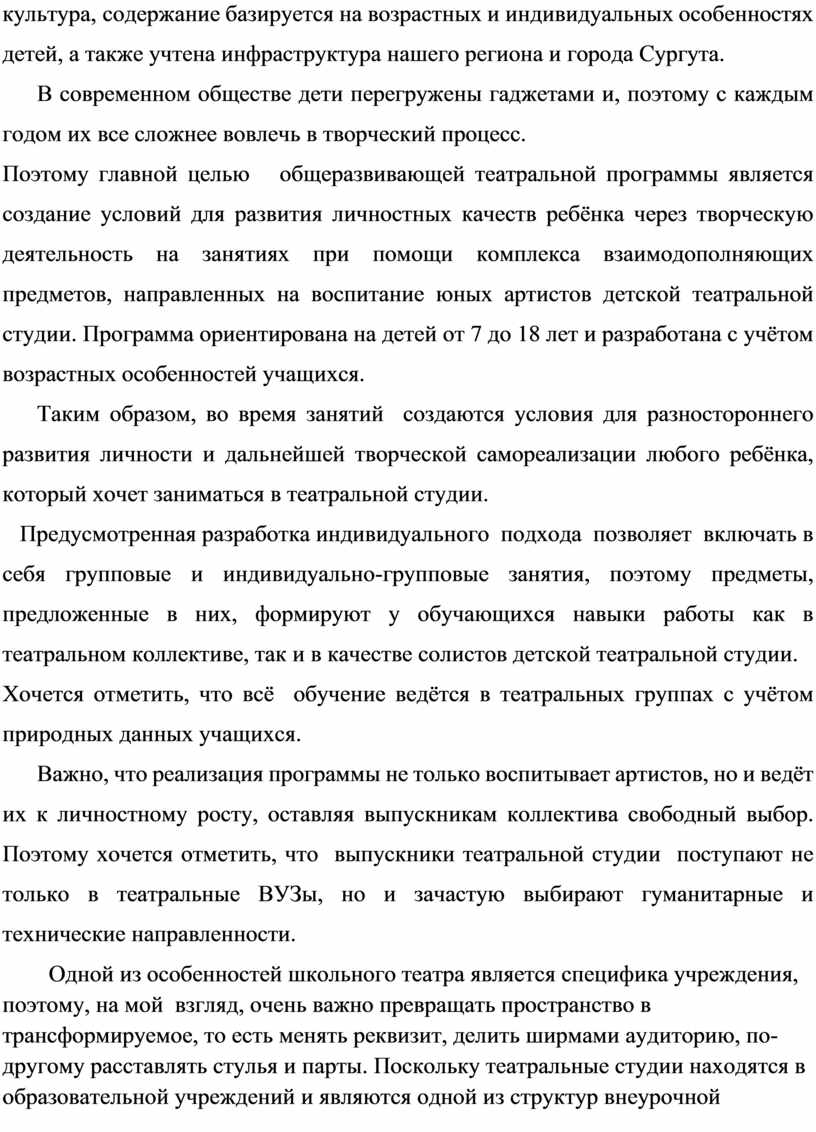 Поэтому главной целью общеразвивающей театральной программы является создание условий для развития личностных качеств ребёнка через творческую деятельность на занятиях при помощи комплекса взаимодополняющих предметов, направленных на воспитание юных артистов детской театральной студии. Программа ориентирована на детей от 7 до 18 лет и разработана с учётом возрастных особенностей учащихся.