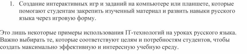 Это лишь некоторые примеры использования IT-технологий на уроках русского языка. Важно выбирать те, которые соответствуют целям и потребностям студентов, чтобы создать максимально эффективную и интересную учебную среду.