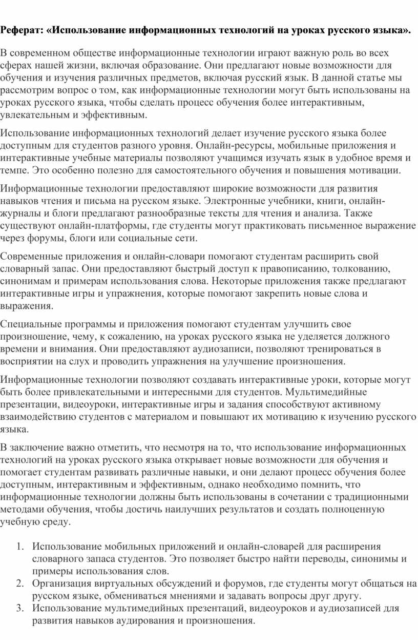 Реферат: «Использование информационных технологий на уроках русского языка».