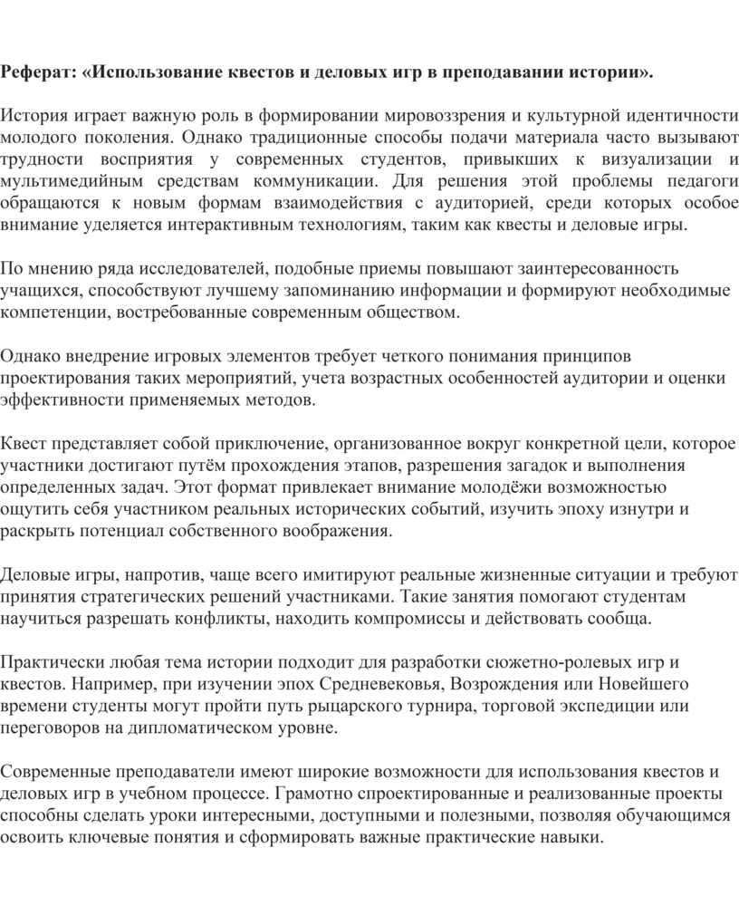 Реферат: «Использование квестов и деловых игр в преподавании истории».