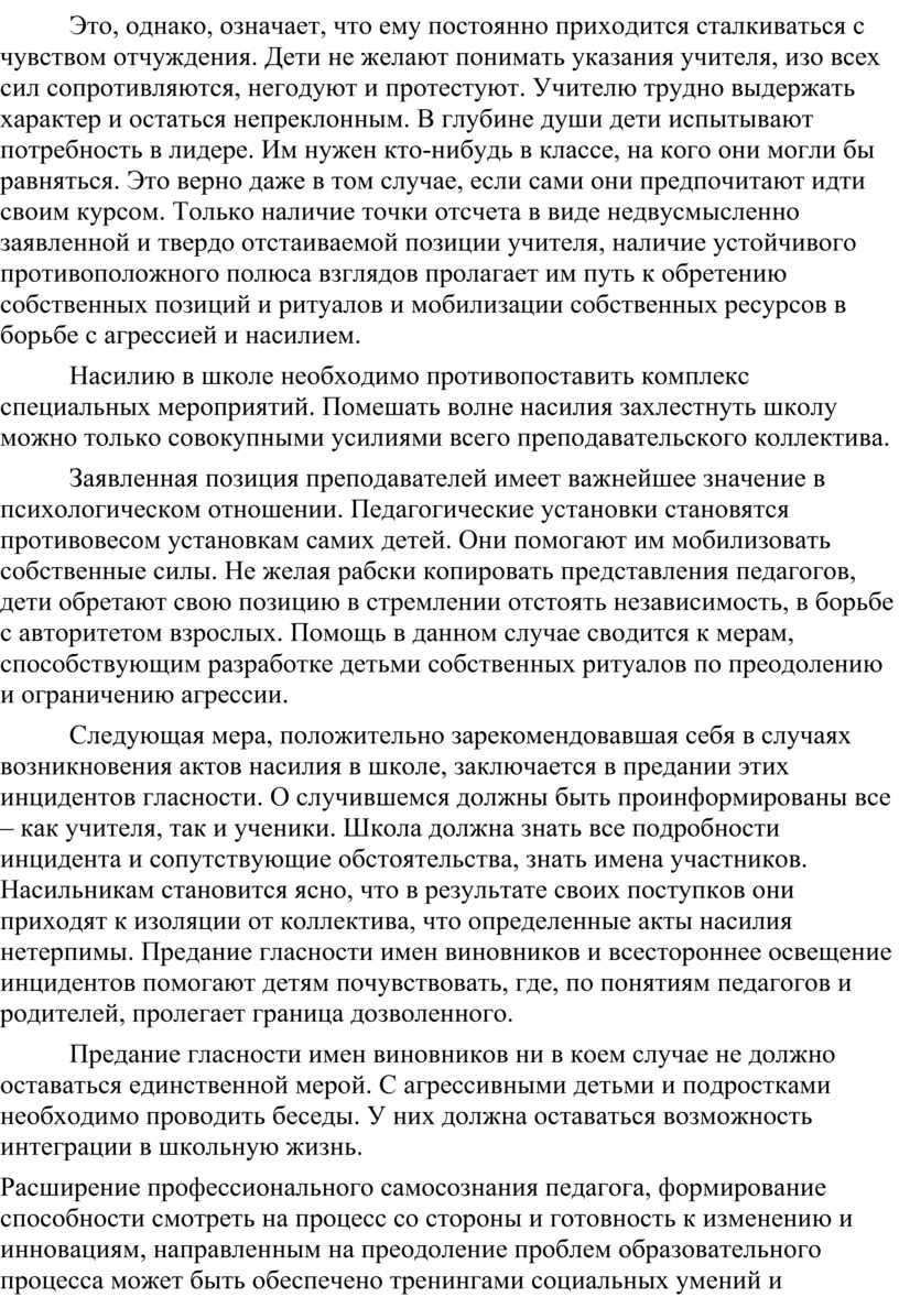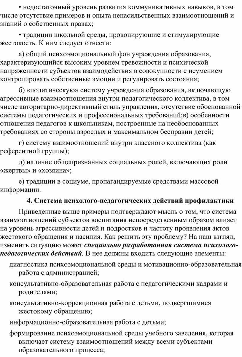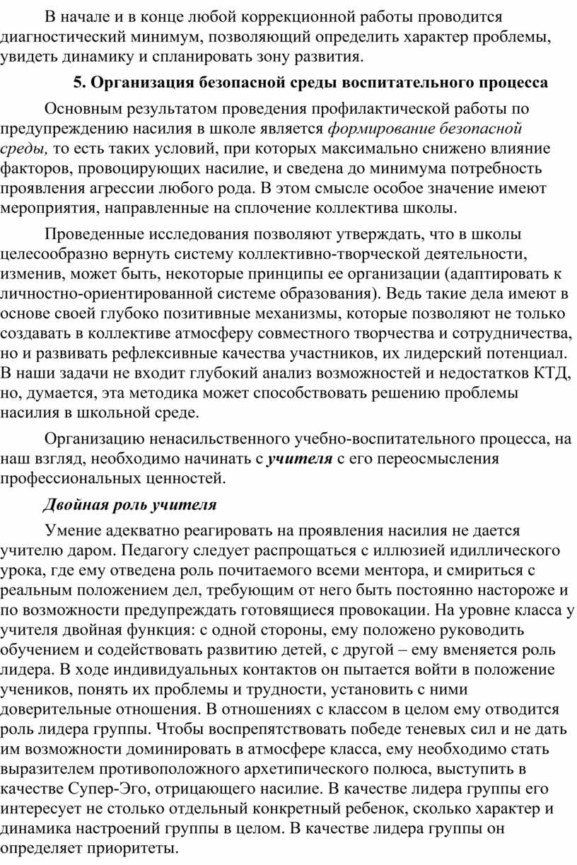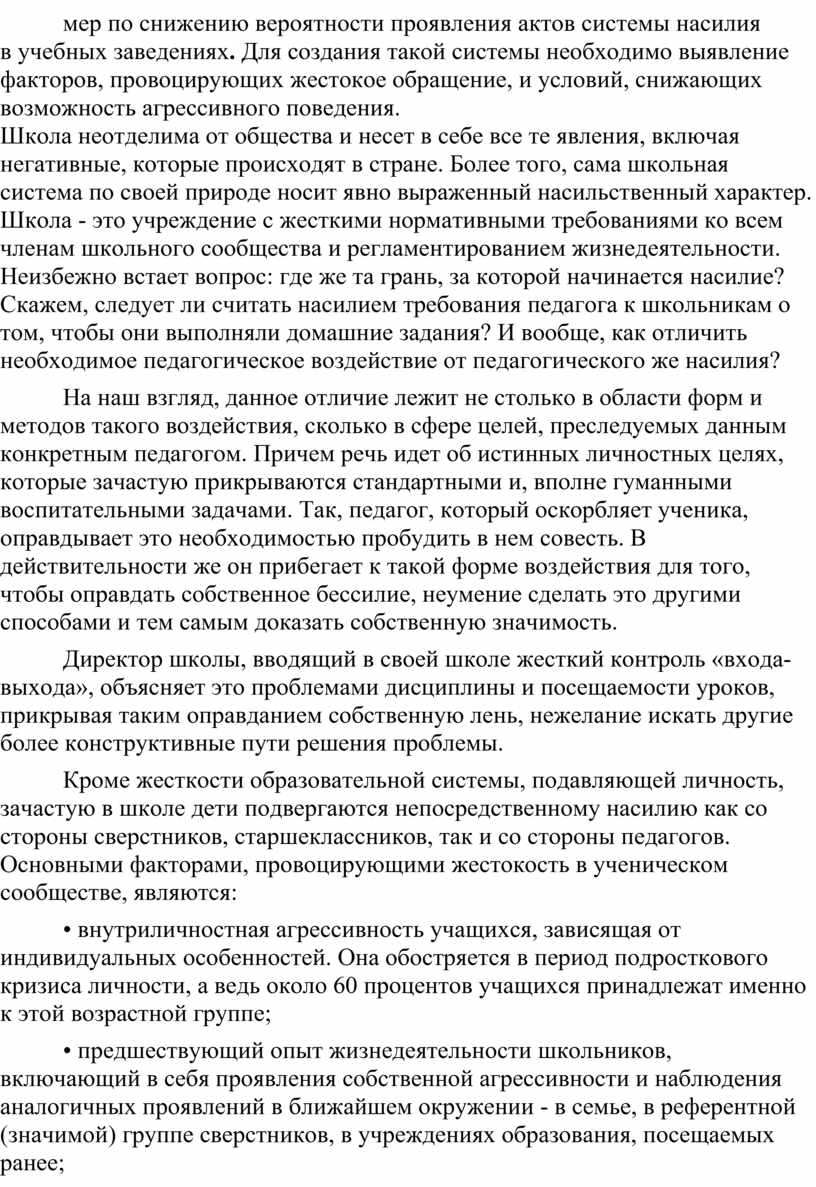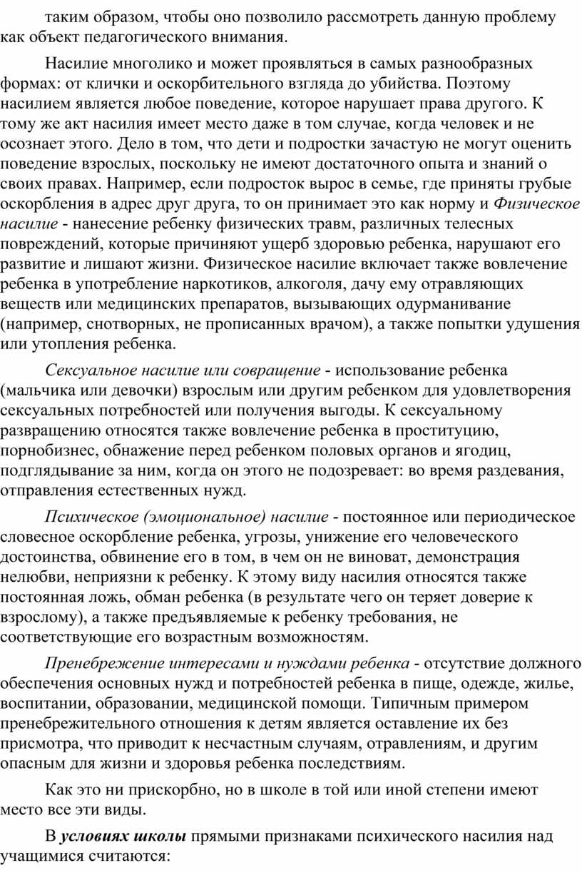 Само понятие насилия рассматривается разными авторами по-разному. От узкого понятия - нанесение физического ущерба другому лицу, - до всеобъемлющей категории - ущемление прав человека. Сформулируем его таким образом, чтобы оно позволило рассмотреть данную проблему как объект педагогического внимания.