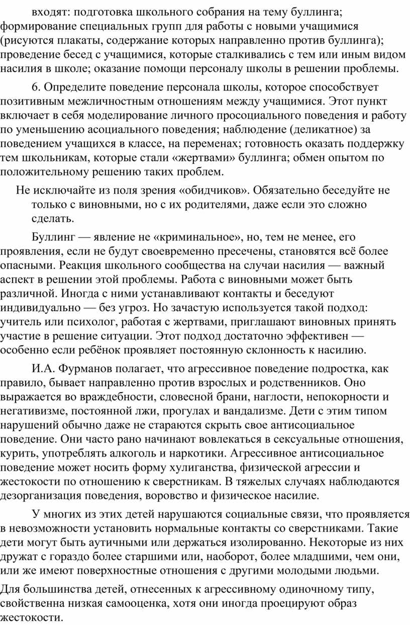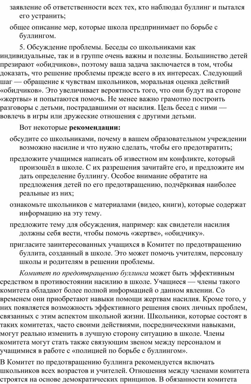6. Определите поведение персонала школы, которое способствует позитивным межличностным отношениям между учащимися. Этот пункт включает в себя моделирование личного просоциального поведения и работу по уменьшению асоциального поведения; наблюдение (деликатное) за поведением учащихся в классе, на переменах; готовность оказать поддержку тем школьникам, которые стали «жертвами» буллинга; обмен опытом по положительному решению таких проблем.