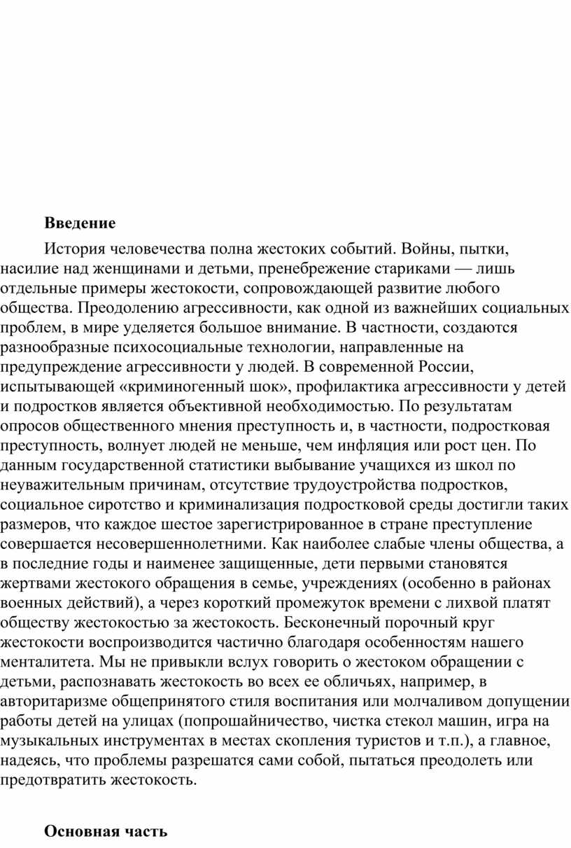 История человечества полна жестоких событий. Войны, пытки, насилие над женщинами и детьми, пренебрежение стариками — лишь отдельные примеры жестокости, сопровождающей развитие любого общества. Преодолению агрессивности, как одной из важнейших социальных проблем, в мире уделяется большое внимание. В частности, создаются разнообразные психосоциальные технологии, направленные на предупреждение агрессивности у людей. В современной России, испытывающей «криминогенный шок», профилактика агрессивности у детей и подростков является объективной необходимостью. По результатам опросов общественного мнения преступность и, в частности, подростковая преступность, волнует людей не меньше, чем инфляция или рост цен. По данным государственной статистики выбывание учащихся из школ по неуважительным причинам, отсутствие трудоустройства подростков, социальное сиротство и криминализация подростковой среды достигли таких размеров, что каждое шестое зарегистрированное в стране преступление совершается несовершеннолетними. Как наиболее слабые члены общества, а в последние годы и наименее защищенные, дети первыми становятся жертвами жестокого обращения в семье, учреждениях (особенно в районах военных действий), а через короткий промежуток времени с лихвой платят обществу жестокостью за жестокость. Бесконечный порочный круг жестокости воспроизводится частично благодаря особенностям нашего менталитета. Мы не привыкли вслух говорить о жестоком обращении с детьми, распознавать жестокость во всех ее обличьях, например, в авторитаризме общепринятого стиля воспитания или молчаливом допущении работы детей на улицах (попрошайничество, чистка стекол машин, игра на музыкальных инструментах в местах скопления туристов и т.п.), а главное, надеясь, что проблемы разрешатся сами собой, пытаться преодолеть или предотвратить жестокость.