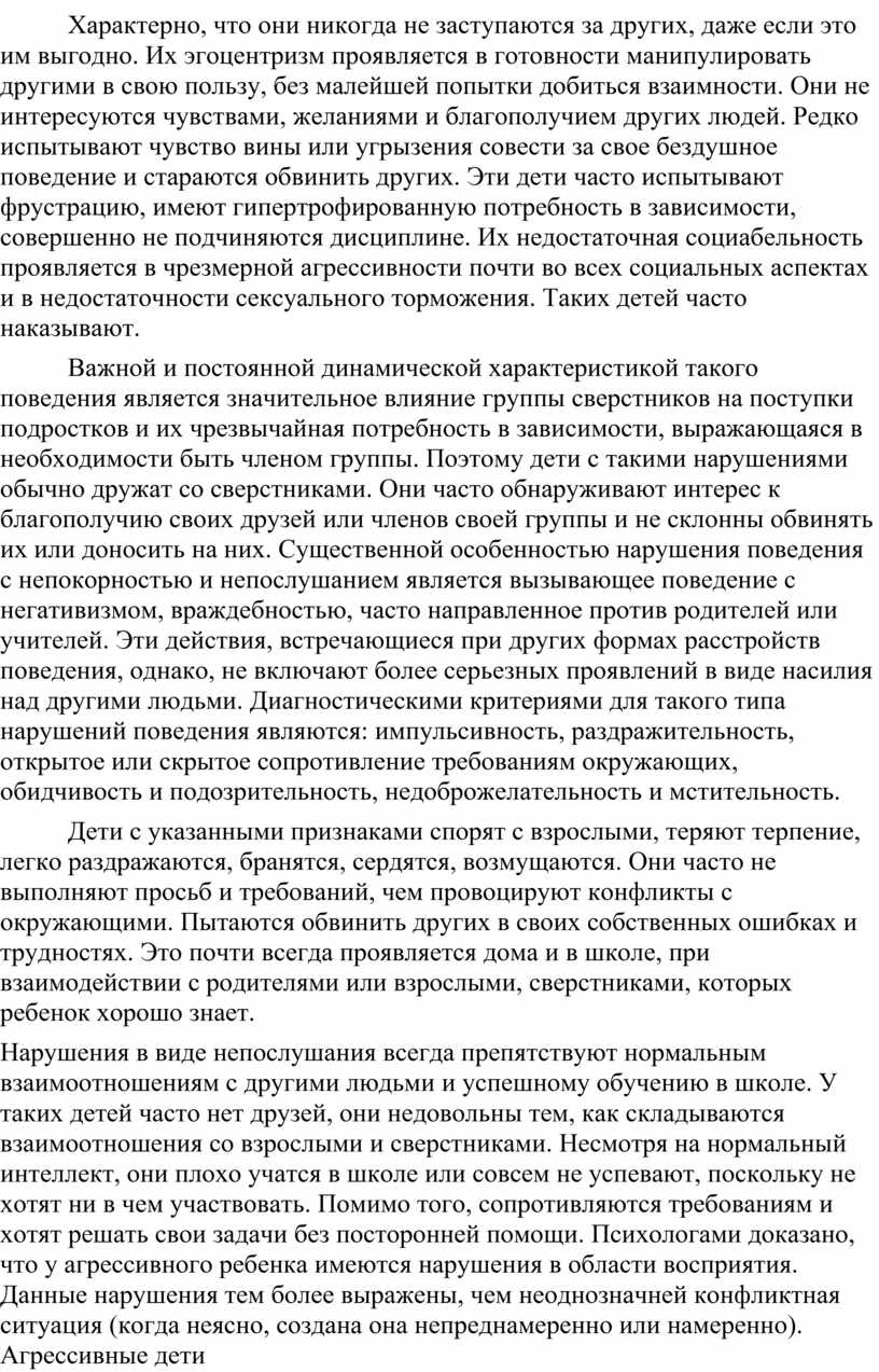 И.А. Фурманов полагает, что агрессивное поведение подростка, как правило, бывает направленно против взрослых и родственников. Оно выражается во враждебности, словесной брани, наглости, непокорности и негативизме, постоянной лжи, прогулах и вандализме. Дети с этим типом нарушений обычно даже не стараются скрыть свое антисоциальное поведение. Они часто рано начинают вовлекаться в сексуальные отношения, курить, употреблять алкоголь и наркотики. Агрессивное антисоциальное поведение может носить форму хулиганства, физической агрессии и жестокости по отношению к сверстникам. В тяжелых случаях наблюдаются дезорганизация поведения, воровство и физическое насилие.