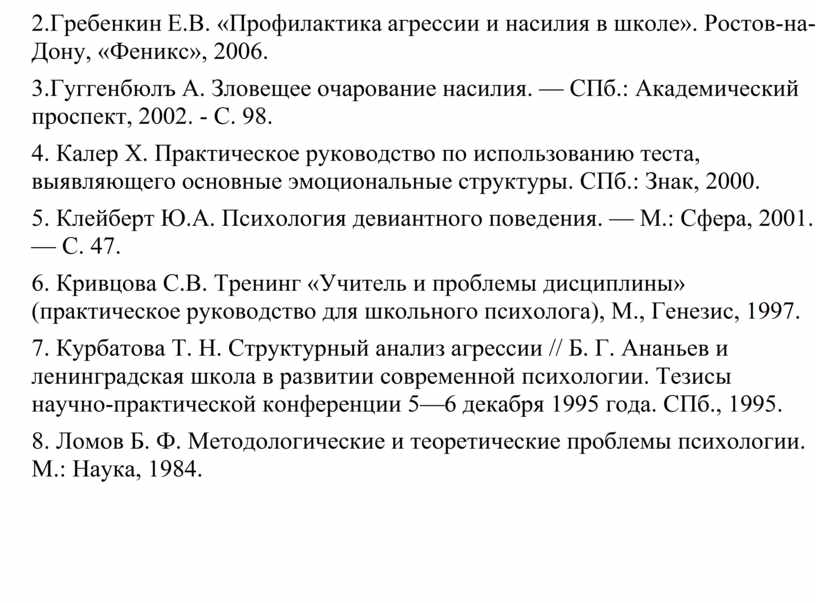 2.Гребенкин Е.В. «Профилактика агрессии и насилия в школе». Ростов-на-Дону, «Феникс», 2006.