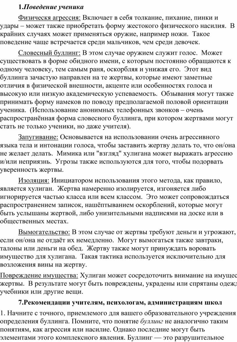 1. Начните с точного, приемлемого для вашего образовательного учреждения определения буллинга. Помните, что понятие буллинг не аналогично таким понятиям, как агрессия или насилие. Однако последние могут быть элементами этого комплексного явления. Буллинг — это разрушительное поведение более «сильных», направленное на более «слабых». Это не ссоры и драки, в которых участвуют школьники, обладающие одинаковым авторитетом. Буллинг не бывает справедливым, так как «сильный» получает «удовольствие» от нанесённого ущерба (материального и морального) «слабому».