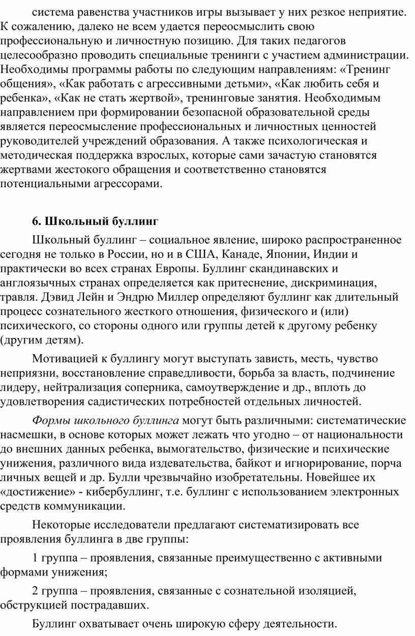 Интересно отметить, что у педагогов, склонных к жесткому подавлению воспитанников, проявляется резко негативное отношение к таким играм. Сама система равенства участников игры вызывает у них резкое неприятие. К сожалению, далеко не всем удается переосмыслить свою профессиональную и личностную позицию. Для таких педагогов целесообразно проводить специальные тренинги с участием администрации. Необходимы программы работы по следующим направлениям: «Тренинг общения», «Как работать с агрессивными детьми», «Как любить себя и ребенка», «Как не стать жертвой», тренинговые занятия. Необходимым направлением при формировании безопасной образовательной среды является переосмысление профессиональных и личностных ценностей руководителей учреждений образования. А также психологическая и методическая поддержка взрослых, которые сами зачастую становятся жертвами жестокого обращения и соответственно становятся потенциальными агрессорами.